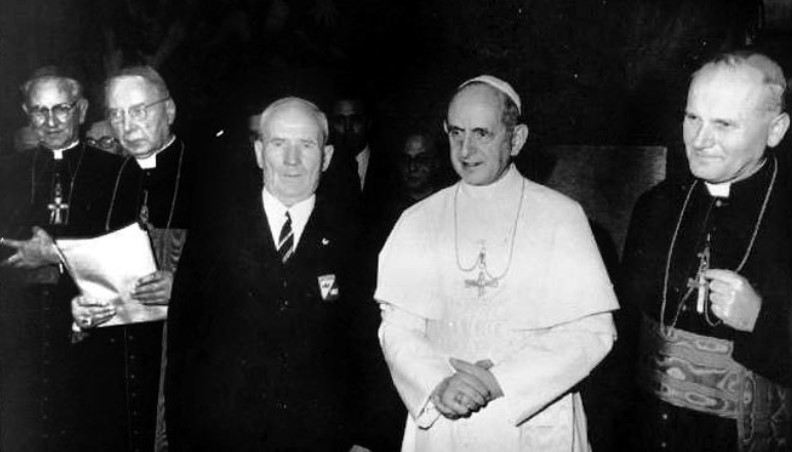 Watykan 1971, F.Gajowniczek i papież Paweł VI, po prawej Kardynał Stefan Wyszyński, po lewej Kadrynał Karol Wojtyła